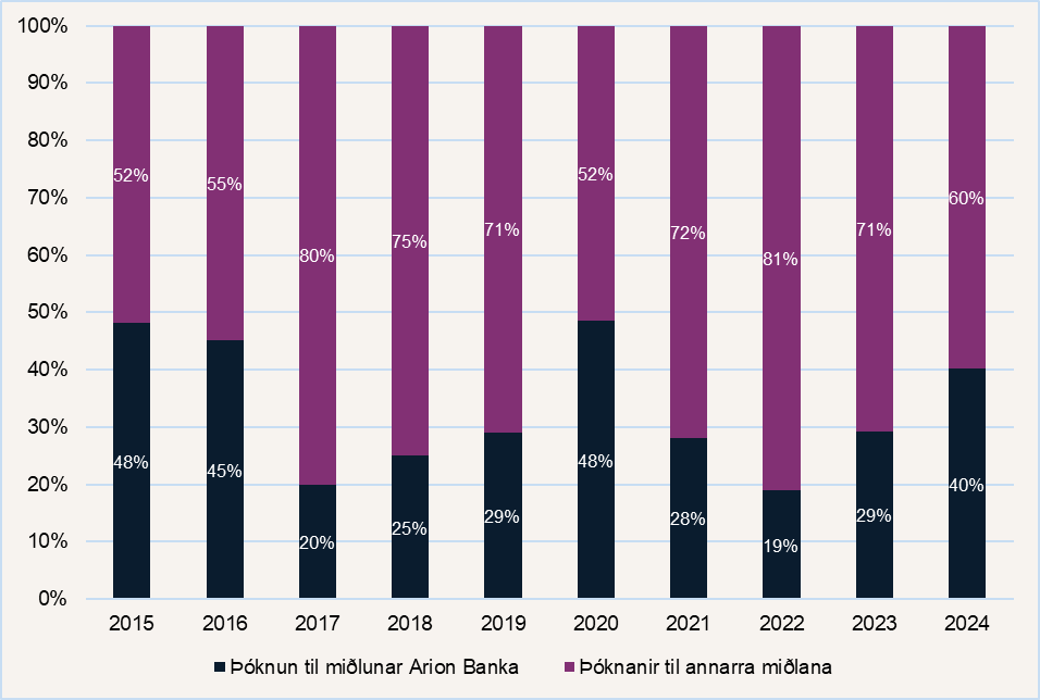 Hlutfallsleg skipting miðlunarþóknana sjóða í rekstri Stefnis milli Arion banka og annarra miðlana frá árinu 2015